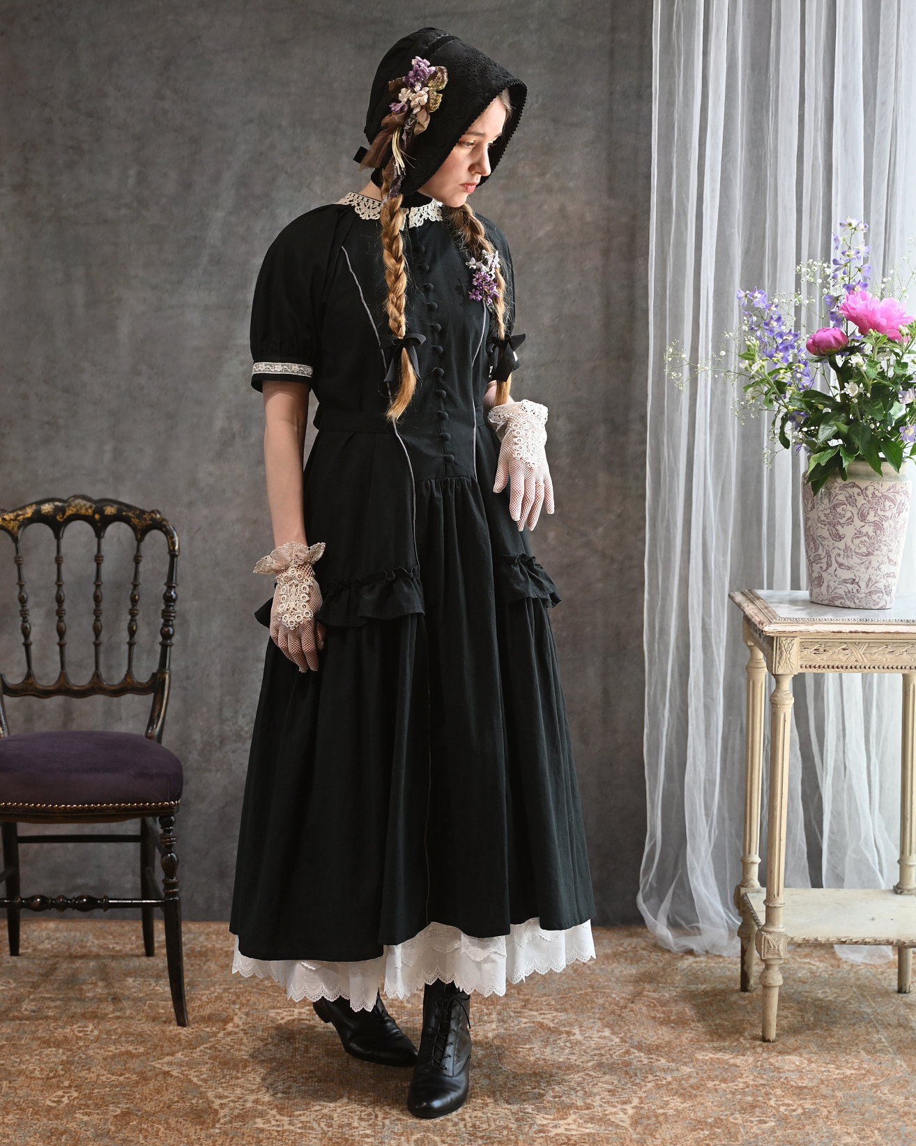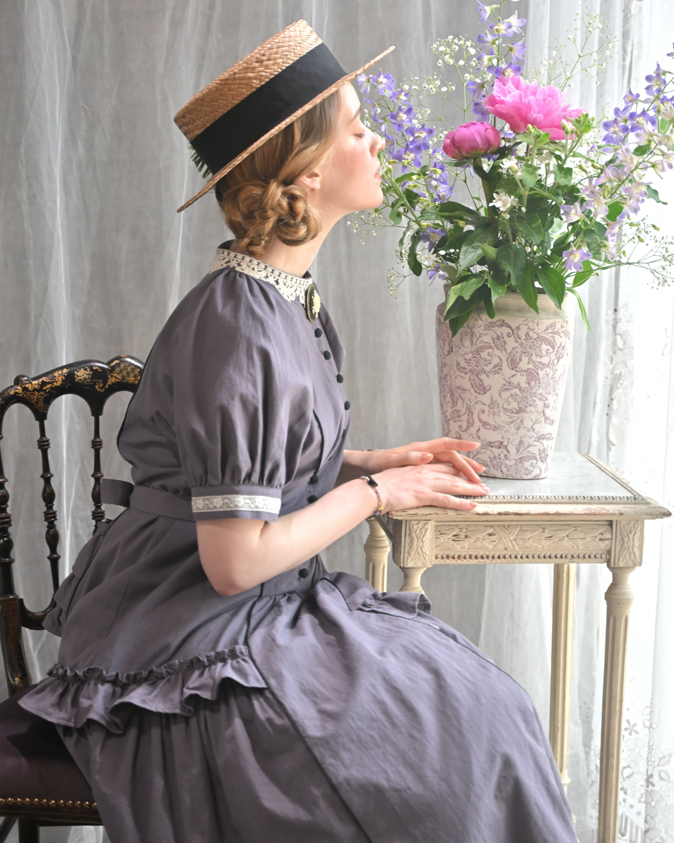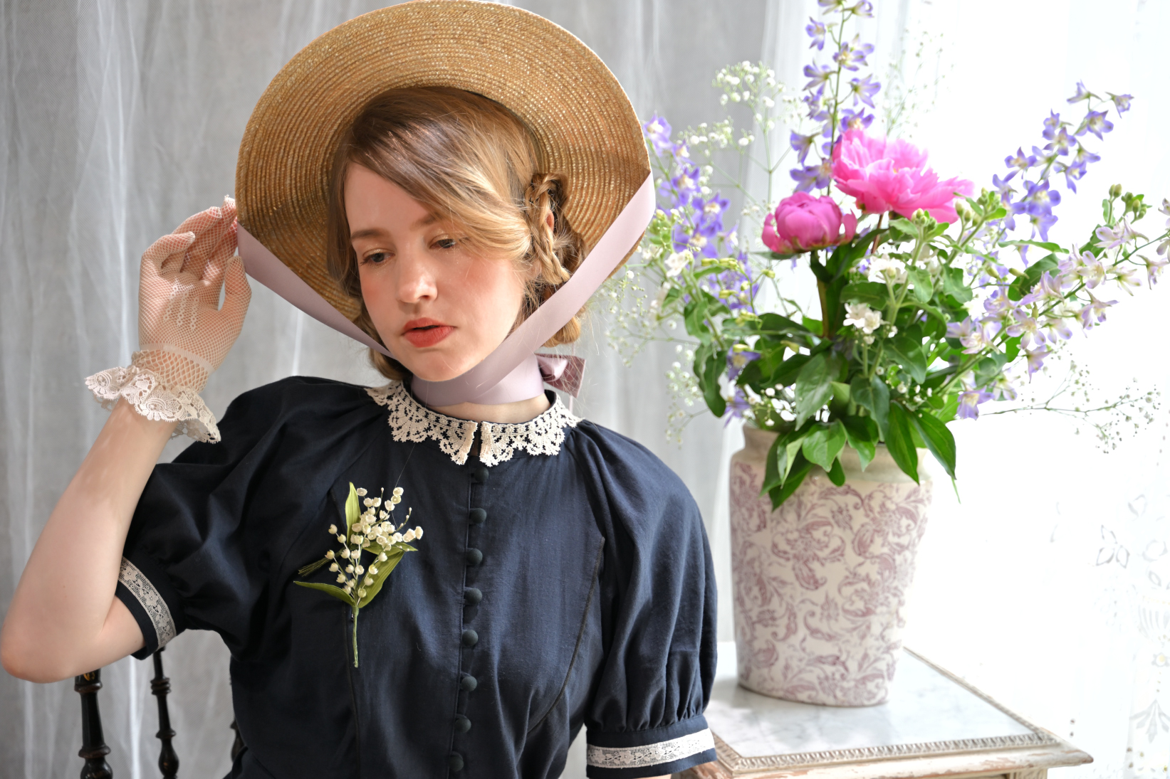 [model]Ariana SERAPHIM(アネモネのドレス/リリーペチコート/パストラルボンネット), Atelier Ophelia(ベルジェールハット) etoile.d.amour(お花のカメオブローチ/蜥蜴のアンティークフレンチジェットブレスレット), nico handwork items(コサージュ) Pink Rosetta(コサージュ), カンカン帽(私物/非買)